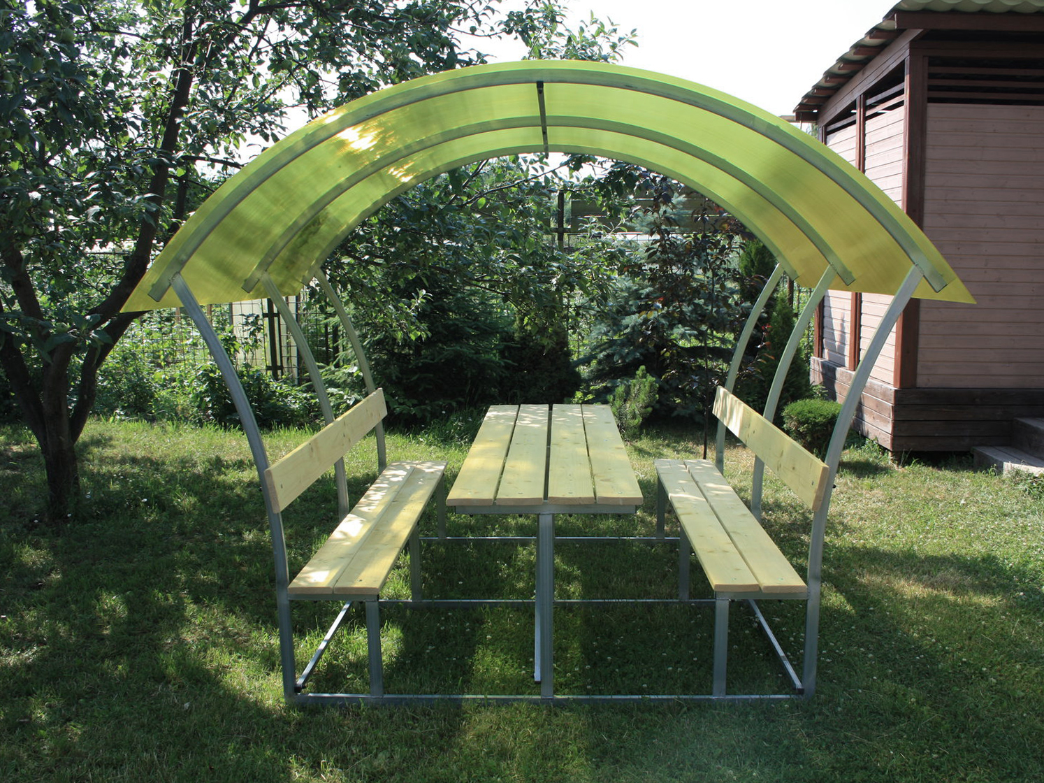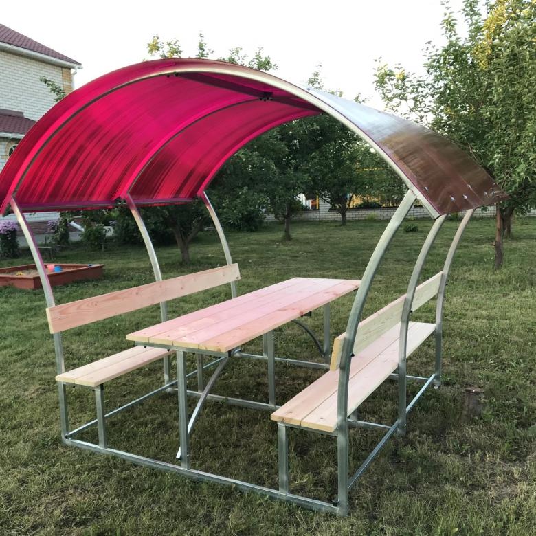 Цвет на выбор: прозрачный, бронзовый, гранатовый, жёлтый, зелёный, красный, белый, бирюзовый, серый, синий. Столешница и лавки изготовлены из шлифованной сухой обрезной доски (без покрытия).