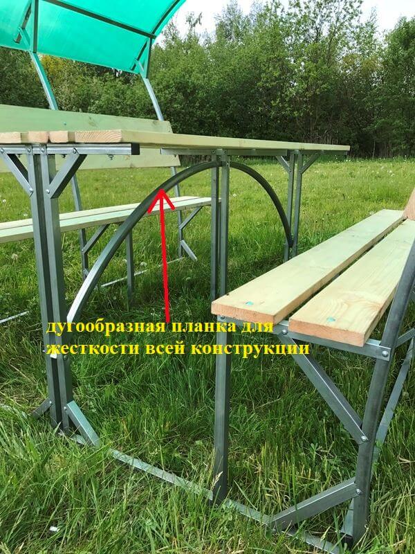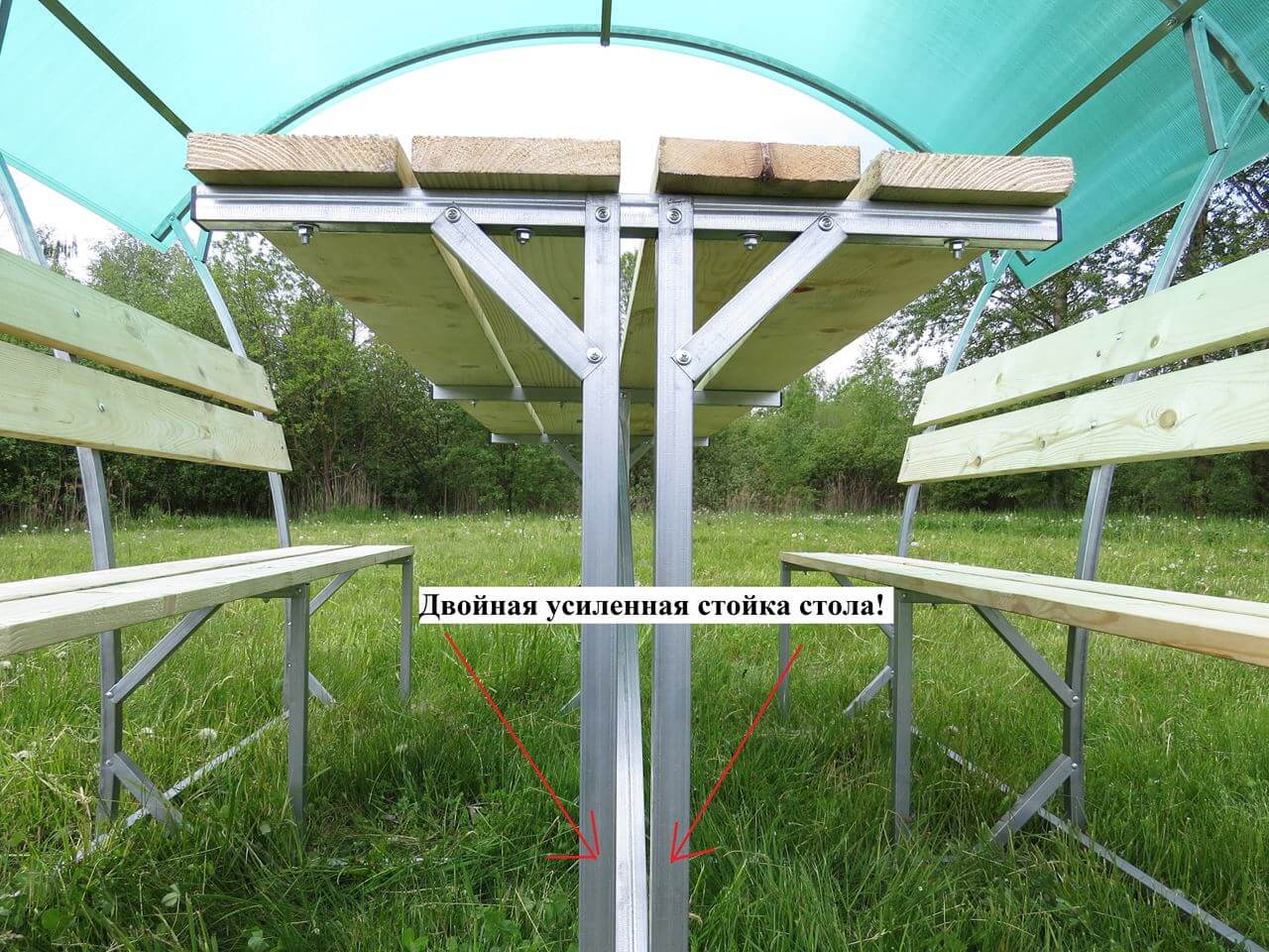 - Двойная опора стола. Упор стола выполнен из двойной трубы квадратного сечения 25х25 мм с укосинами. Данная конструкция позволяет быть уверенным в жесткости и надежности стола, а так же всей конструкции беседки в общем.