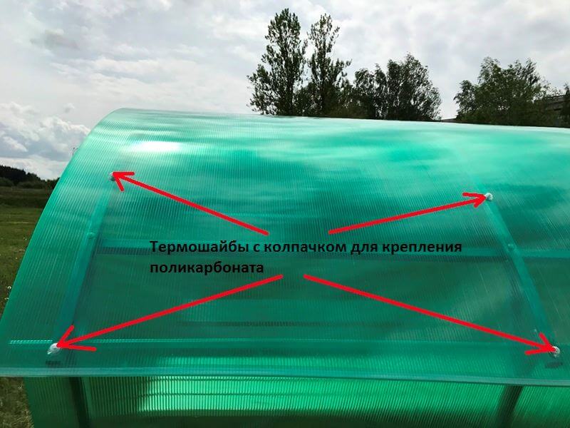 - Термошайбы для крепления сотового поликарбоната. Сотовый поликарбонат крепиться специальными термошайбами с колпачком. Данный вид крепления более надежный и долговечный по сравнению с кровельными саморезами. Шайба имеет больший диаметр и мягкие кроя которые не передавливают поликарбонат.