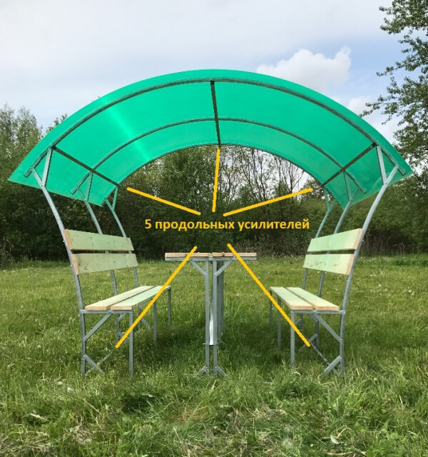 - Продольные стрингера. Каркас беседки имеет видимых три продольных стрингера и два в основании. Большее количество данных элементов усиливают каркас беседки по снеговым и ветровым нагрузкам.