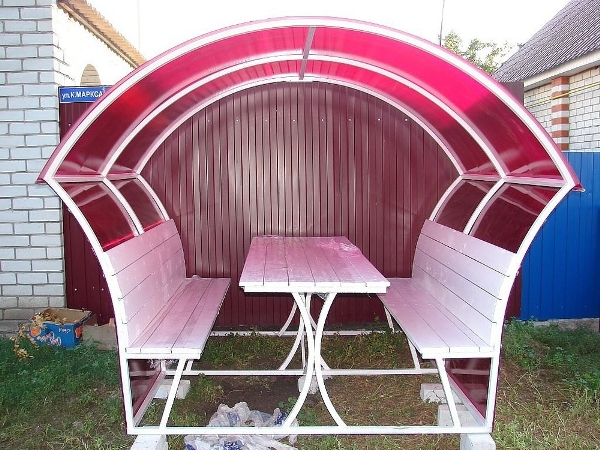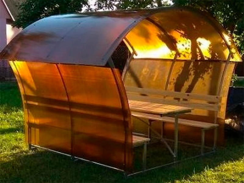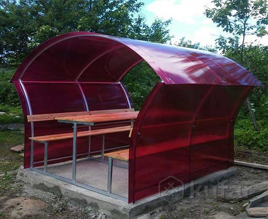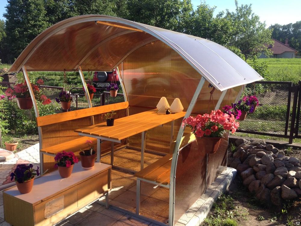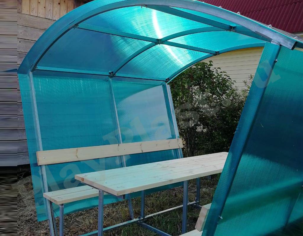 Верх покрывается сотовым поликарбонатом. Цвет на выбор: прозрачный, бронзовый, гранат, желтый, зеленый, красный, белый, бирюза, серый, синий.