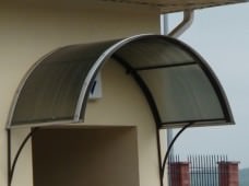 Навесы из этого легкого и долговечного материала пользуются повышенным спросом не случайно. Высокая прочность в сочетании с гибкостью позволяют создавать из него козырьки любой сложности. Небольшой вес поликарбоната дает возможность использовать для изготовления каркаса под него алюминиевый профиль, отличающийся долгим сроком службы. Но наиболее эффектно и богато смотрятся козырьки с кованой аркой, украшенной вензелями.