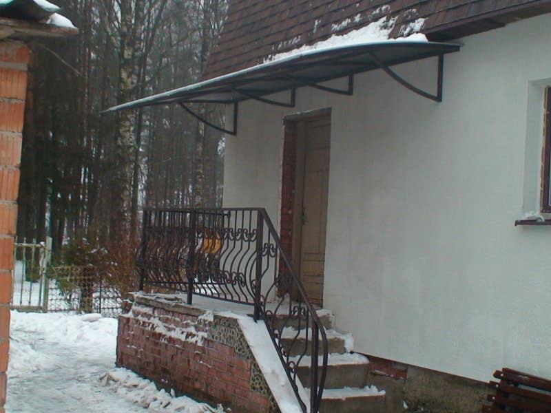 Навесы из этого легкого и долговечного материала пользуются повышенным спросом не случайно. Высокая прочность в сочетании с гибкостью позволяют создавать из него козырьки любой сложности. Небольшой вес поликарбоната дает возможность использовать для изготовления каркаса под него алюминиевый профиль, отличающийся долгим сроком службы. Но наиболее эффектно и богато смотрятся козырьки с кованой аркой, украшенной вензелями.